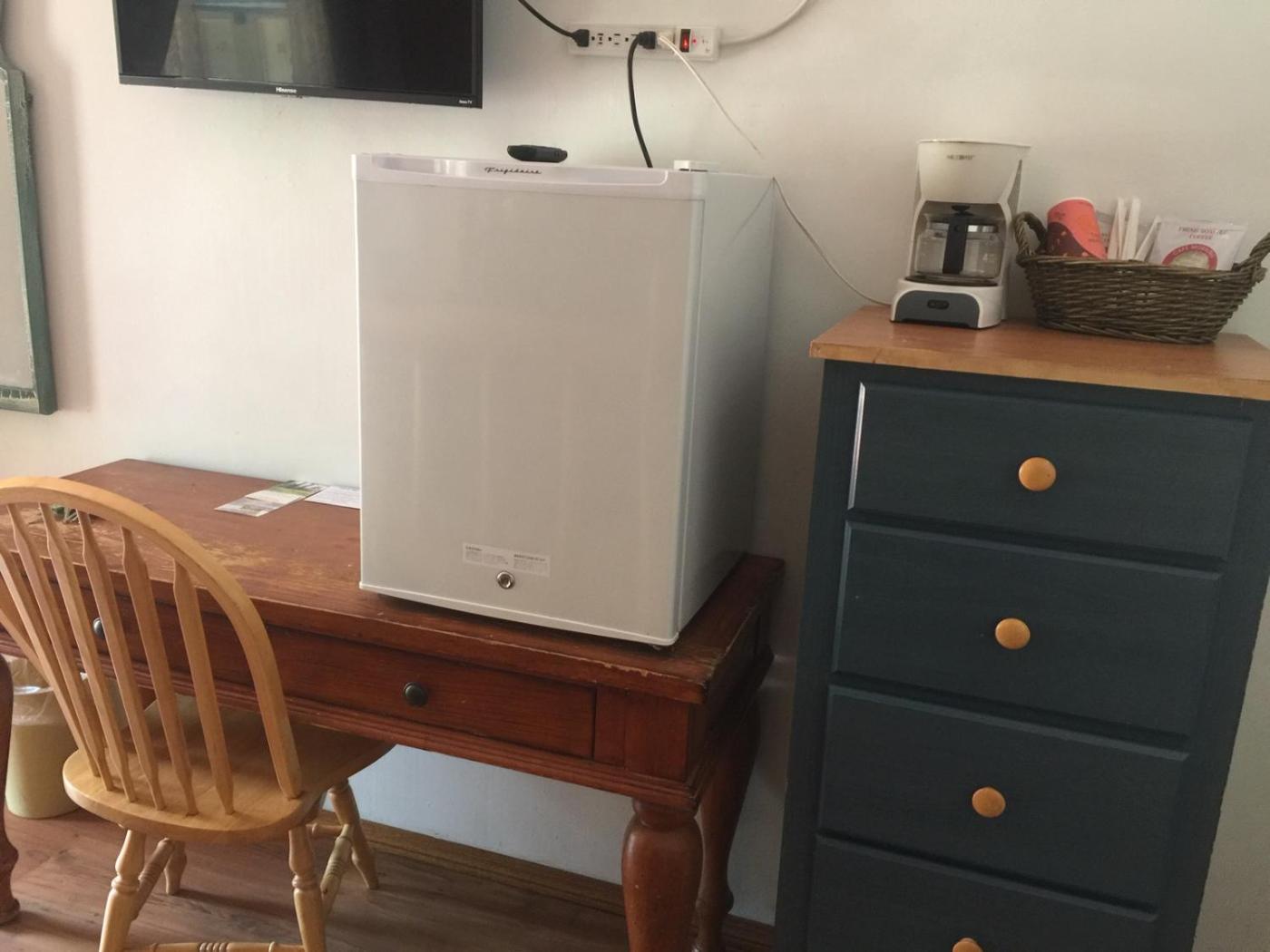 Deluxe King Suite. Our Premier Room 1 is more spacious than other rooms at Dunsmuir Lodge, and is separated from the rest of the Lodge for privacy. Favored by most of our return guests, This room comes with an electric fireplace for an added touch of ambiance. Why not try our Premier Room #1?, it opens out on to the porch and front lawnthere is a picnic table under the trees. This Large Room has a Cal King bed with "pillow-top mattress", ceiling fan, AC unit & large flat screen smart TV, refrigerator, microwave coffeetea maker and isapart from other rooms. Private parking space in front of room. ;